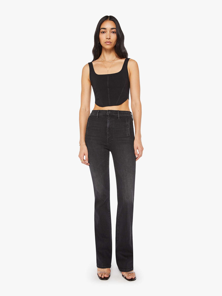 High-rise flare jeans with a zip fly, vertical slit pockets and a long 34-inch inseam with a clean hem. Crafted from soft stretch denim, Spiked Hair Art Flair is a washed black with super-subtle fading and whiskering.