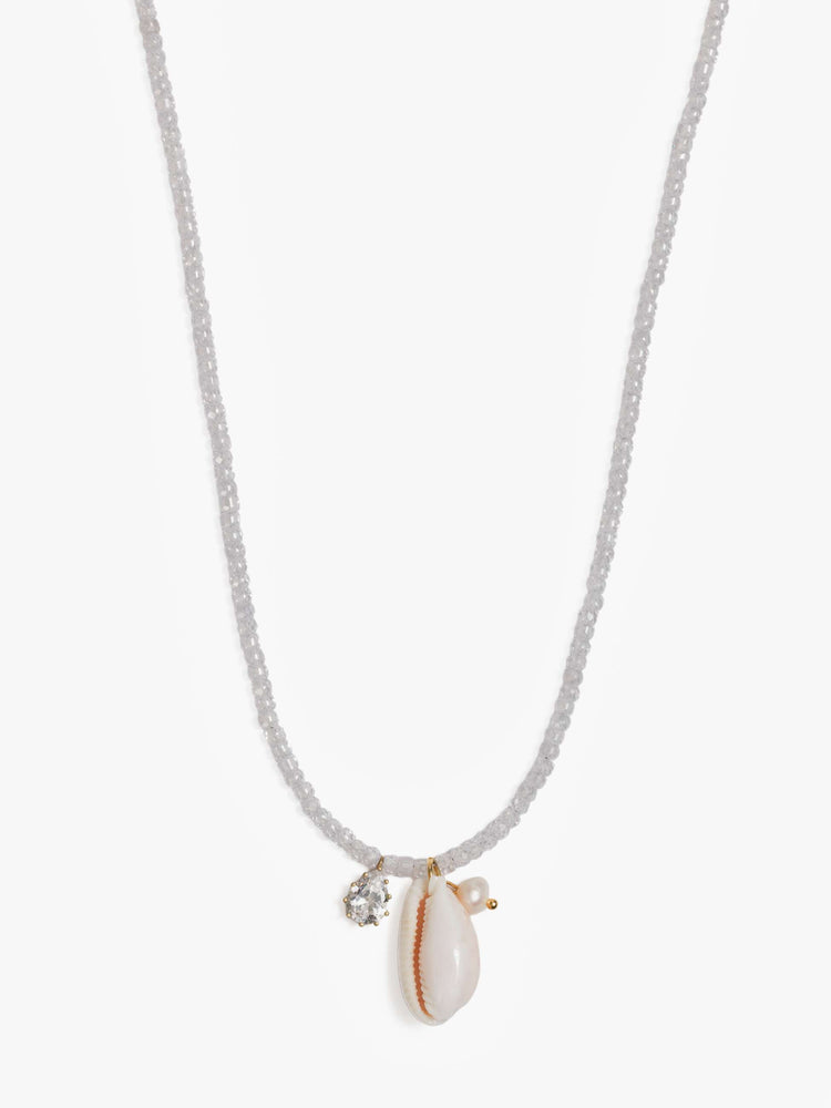 What the shell. LUDA is a Los Angeles jewelry brand inspired by the shorelines of California. Made from wire cord and gold-plated hardware, the beaded necklace features White Zircon beads, brass charms, natural pearls and a natural Cowrie shell.