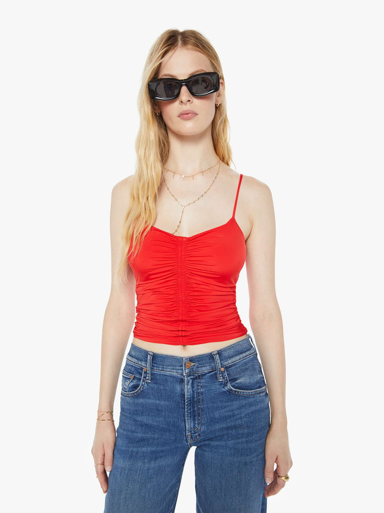 Well red. A tank top from Maria Cher, a brand defined by bold prints and modern neutrals. Designed in bright red, the top features a shallow V-neck, thin spaghetti straps, a gathered seam down the front and a narrow fit. From Buenos Aires with love.