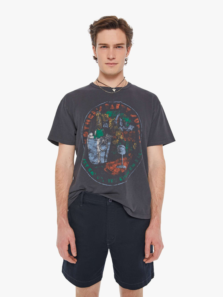 Party time. An oversized tee with drop shoulders and a loose fit. Made from 100% cotton in faded black, the tee features a faded graphic inspired by a vintage party supply advertisement on the front.