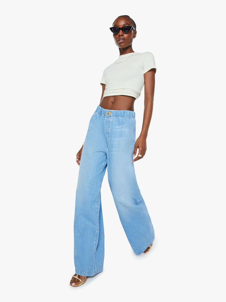 Wide leg jeans from SNACKS!, a collection of unconstrained silhouettes leaning into exaggerated shapes and extreme proportions. Experimental and non-era specific. For everyone, or not. These high-rise jeans have an elastic waistband, loose, wide leg and a long 31-inch inseam with a clean hem. Made from a recycled cotton blend, All You Can Eat is a light-blue with a pretzel-detailed button and candy-inspired interior rivets. Would you like a treat?