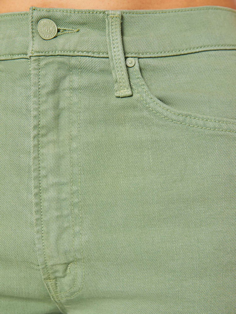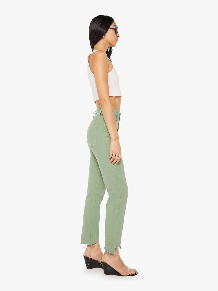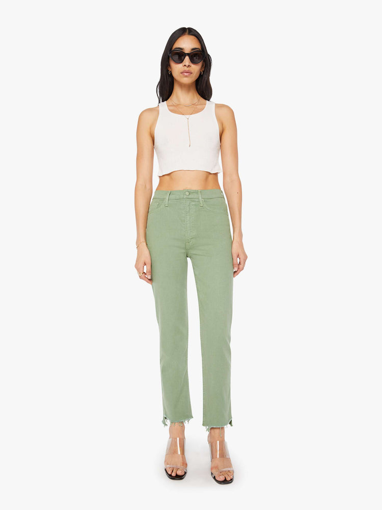 High-rise straight-leg jeans with a zip fly, ankle-length inseam and a frayed step-hem. Made from stretch denim, the jeans are designed in a faded army green with tonal hardware.