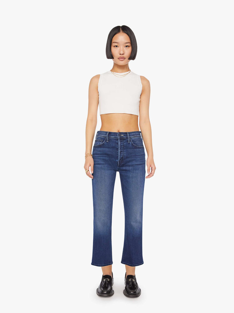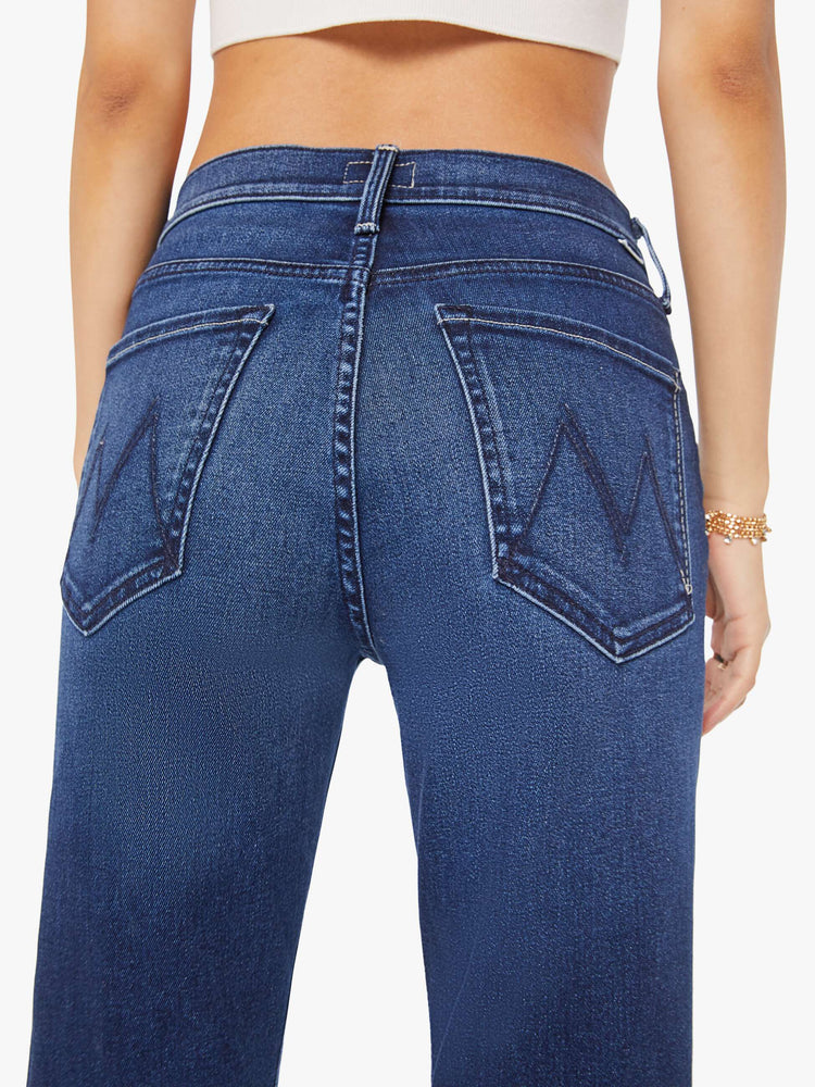 A high-rise flare with a button fly and a clean ankle-length hem. Made from stretch denim, Homecoming High is a dark blue with subtle whiskering and fading at the knees.