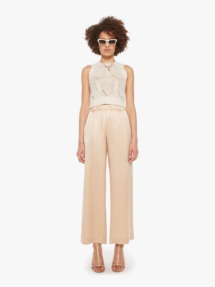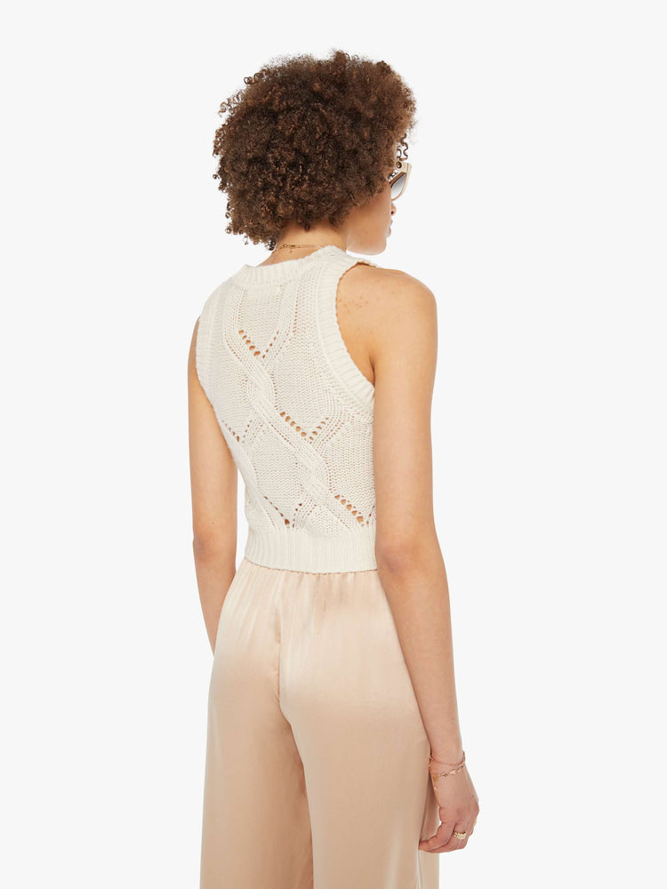 A knit tank from SABLYN, a Los Angeles brand that reimagines the classics through an alchemy of silk, cashmere and leather, with drop shoulders and a slightly cropped fit. The Kara top is made from 100% cashmere in off-white with an open cable-knit design.