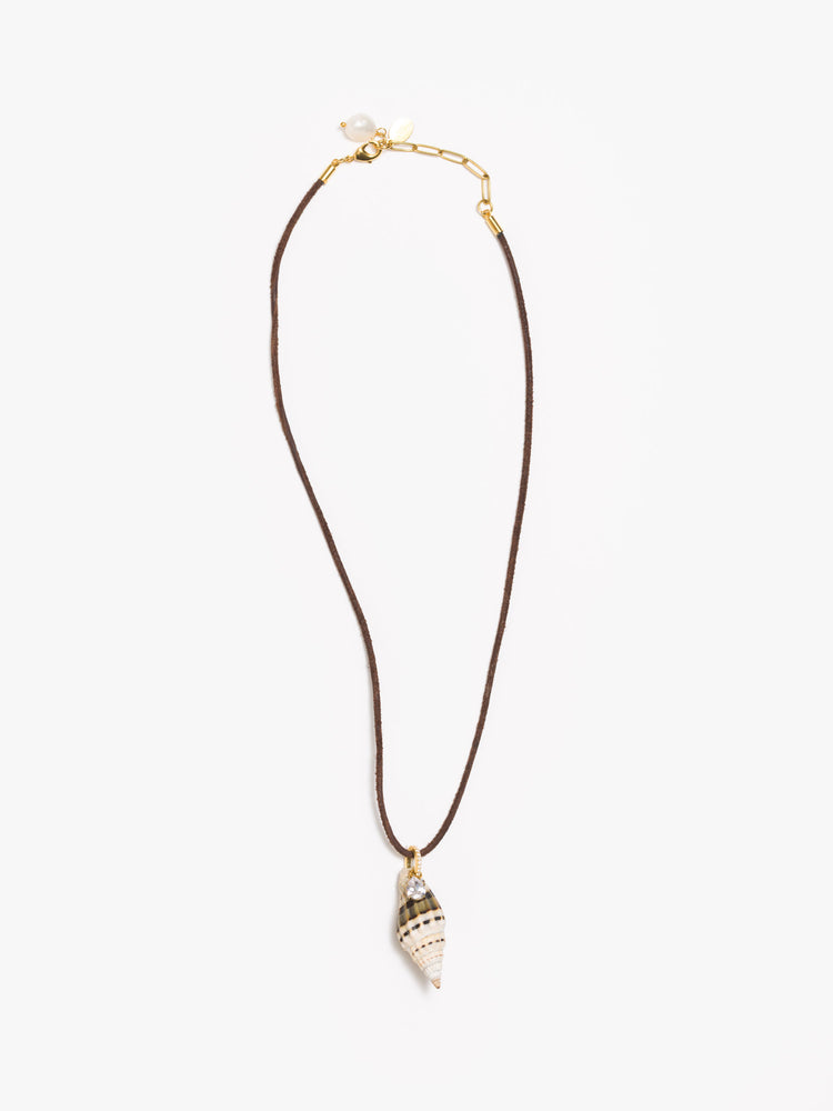 Shore thing. LUDA is a Los Angeles jewelry brand inspired by the shorelines of California. Made from dark brown suede cord and 18k gold-plated hardware, the necklace features a Mitre shell charm with a detachable Moissanite stone and a freshwater pearl on the clasp.