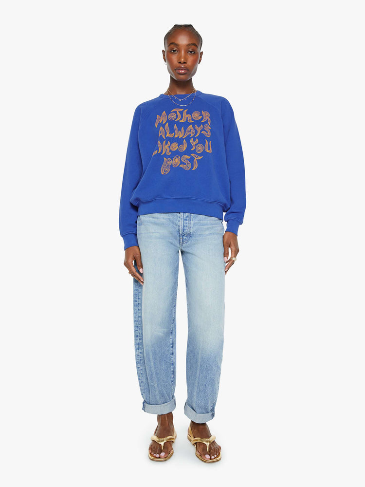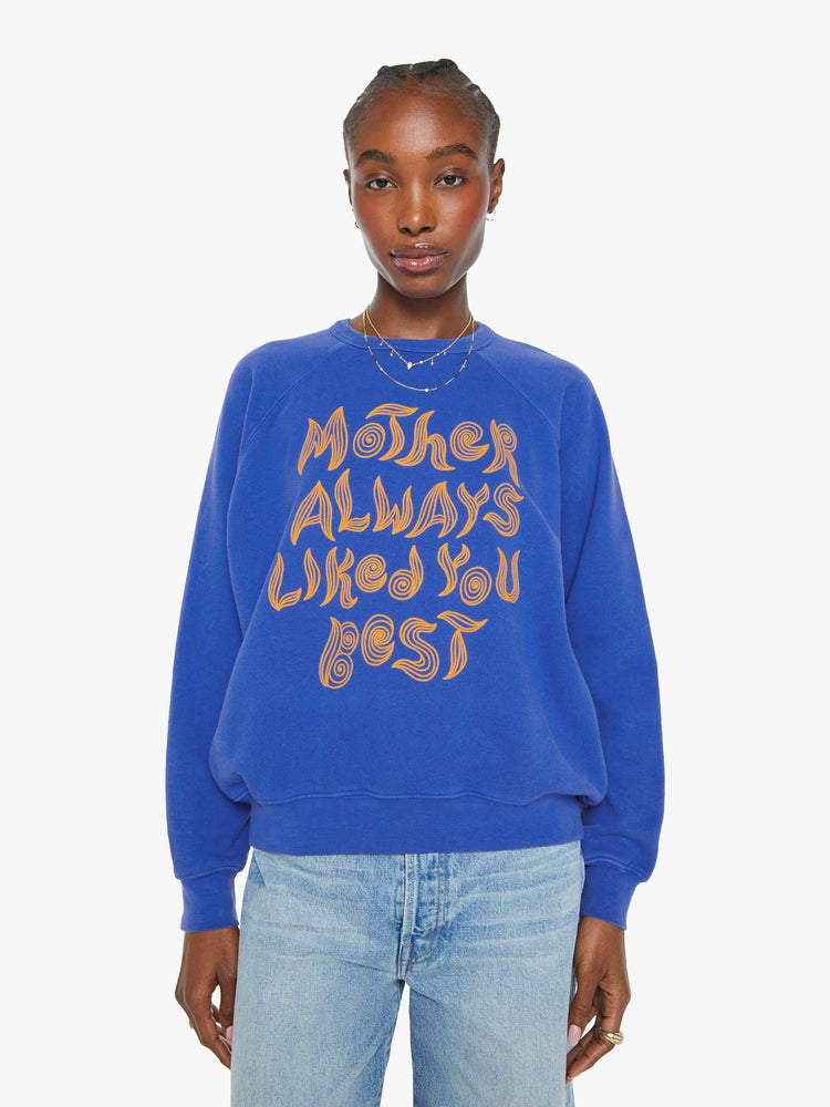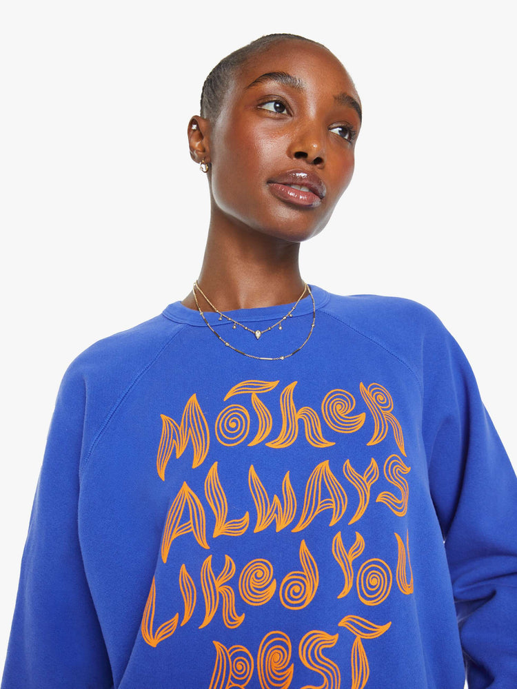 Golden child. An oversized raglan sweatshirt with a crewneck, ribbed hems and a slightly cropped fit. Made from super-soft 100% cotton, the sweatshirt is designed in blue with text in orange on the front.