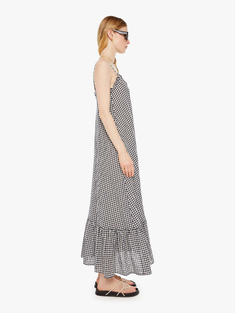 Check it. A sleeveless maxi dress from XiRENA, a free-spirited brand with deep roots in Cali that pays homage to the Golden State’s moods. Made from stretch cotton in a black and white checkered print, the dress has thin straps, a ruffled scoop neck, extra-wide ruffled hem and a loose, flowy fit.