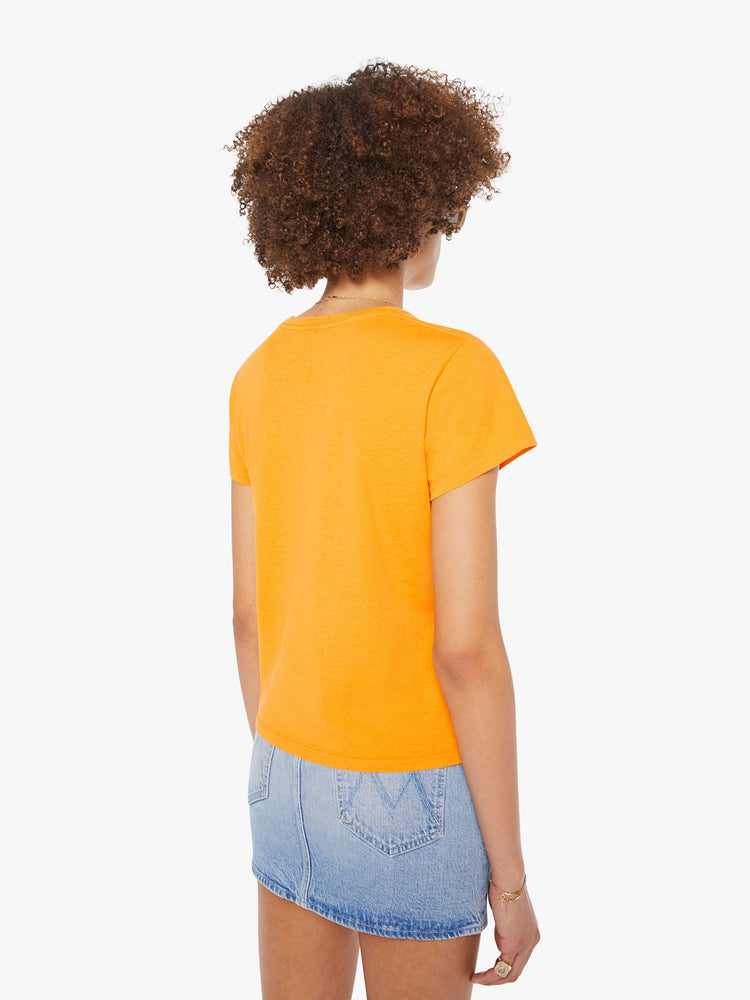 Fair warning. The Lil Goodie Goodie in Baby I'm A Loser is a soft, slightly sheer crewneck with a slim fit for a vintage look and feel. Made from 100% cotton, the bright orange tee features block text in blue on the front.