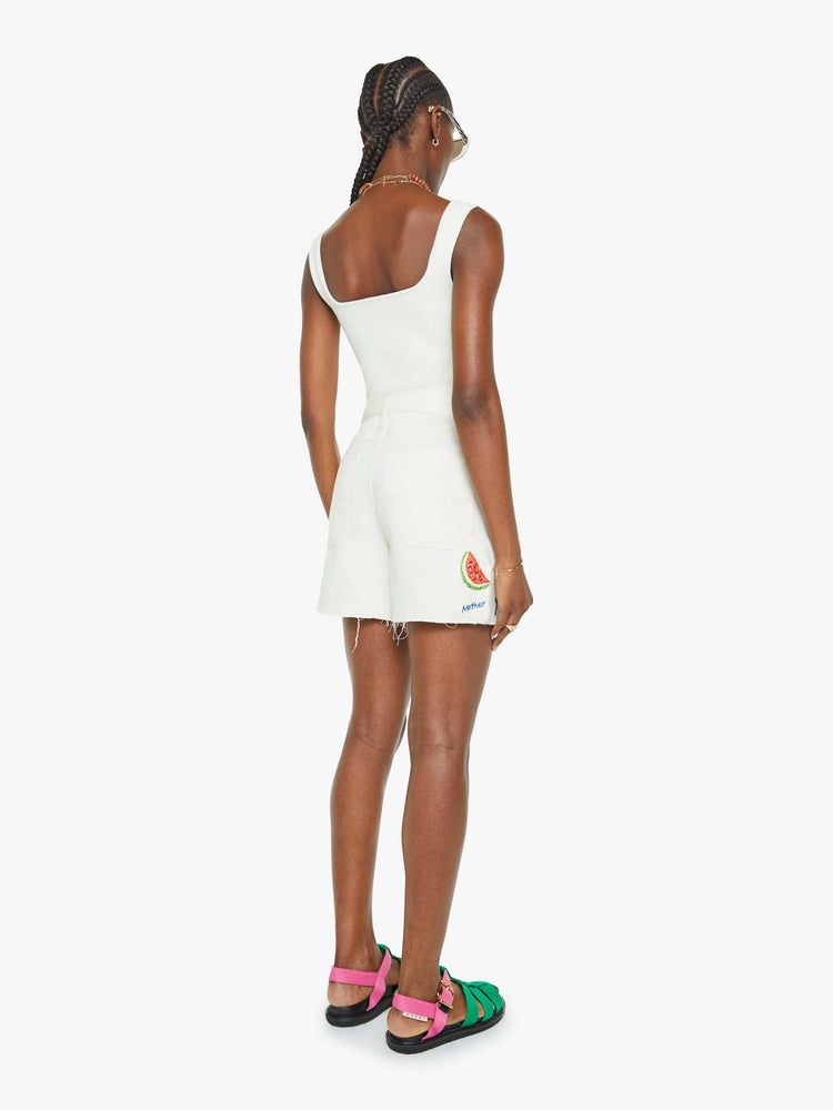 On the bright side. Super high-waisted shorts with a 5-inch inseam, utility pockets, a hammer loop, raw hem and a loose, comfortable fit. Made from lightweight 100% cotton, No Rainbows Without Rain is a creamy off-white with colorful garden-inspired embroidery throughout.