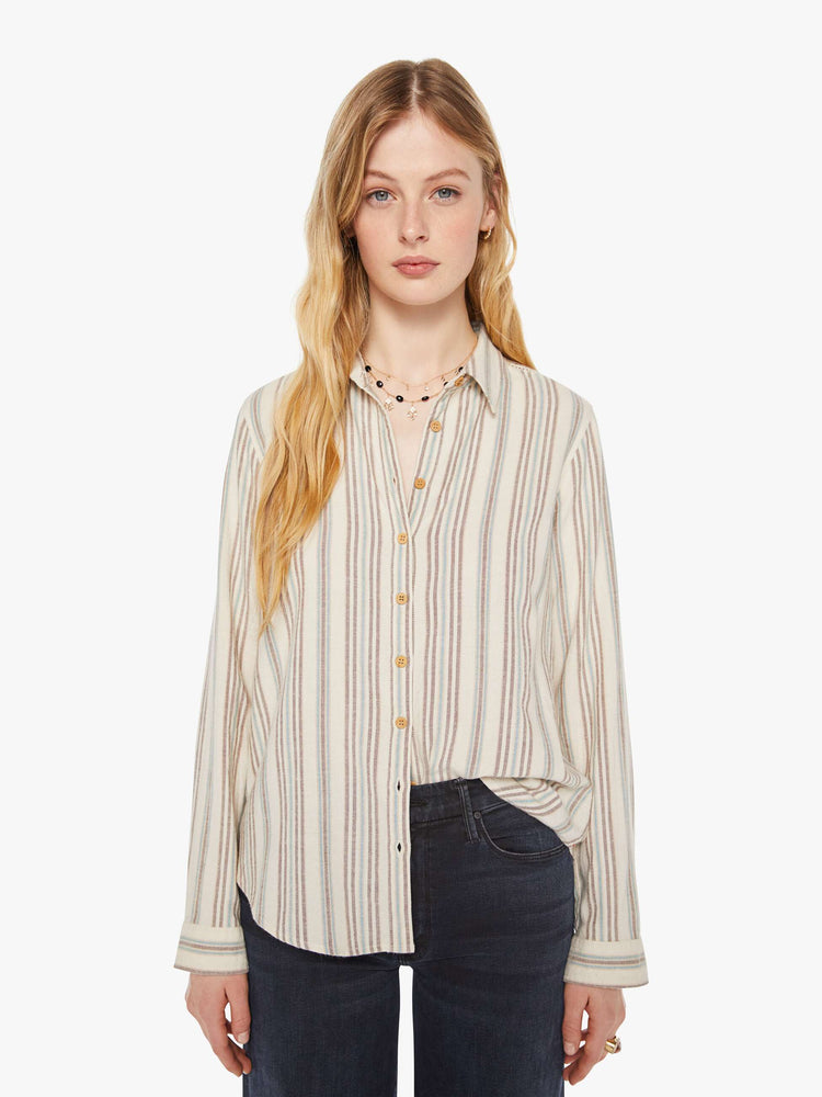 Read between the lines. A striped button-down from XiRENA, a Los Angeles brand that pays homage to the Golden State’s moods. Made of 100% cotton in a cream with grey stripes, the long-sleeve shirt features a V-neck and curved hem with a light and airy fit.