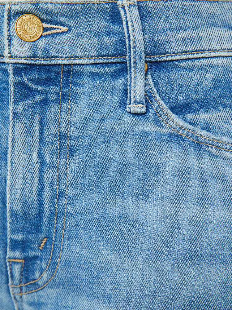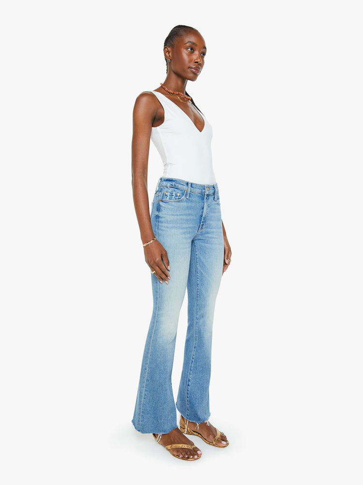 Sunkissed. Our most popular mid-rise flare has a 31-inch inseam with a frayed hem. Cut from stretch denim, Glow Up is a light blue with whiskering and fading.