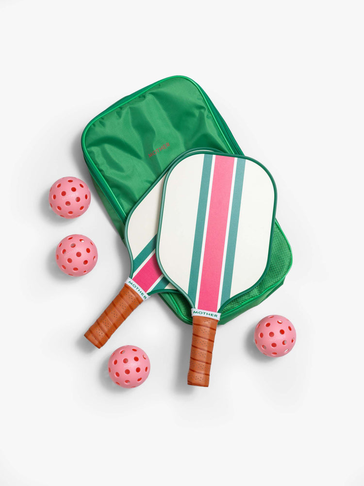 Game, set, MOTHER. A pickleball set with two rackets in cream with green and pink stripes, featuring a honeycomb core for extra pop. MOTHER FUCKER” is printed on the edge guard, so they know who’s serving the heat. Comes with four pink outdoor balls and a green case featuring the MOTHER logo, a mesh pocket, ribbed top handle and adjustable strap. Play nice. Or don’t.
