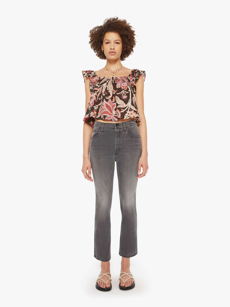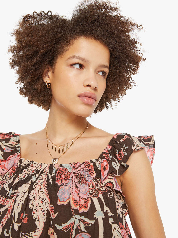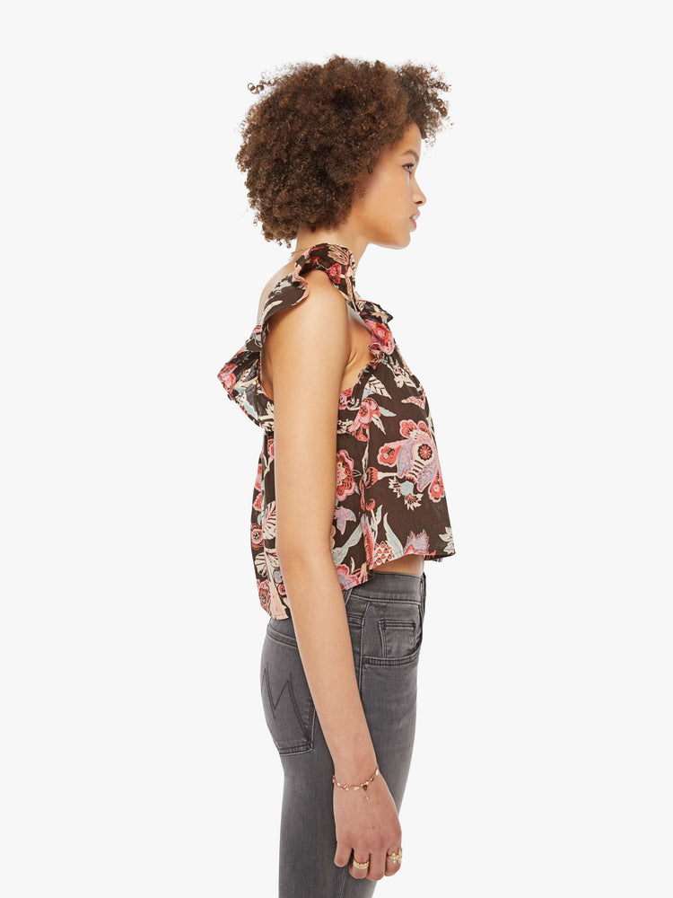 Once and floral. Alix of Bohemia is a New York brand that embodies the vibe of the 70s with hand-embroidered details and artisan craftsmanship. The Sera top is made from 100% linen in brown with a pink and cream floral print, and features square neck, ruffled straps and a loose, cropped fit.