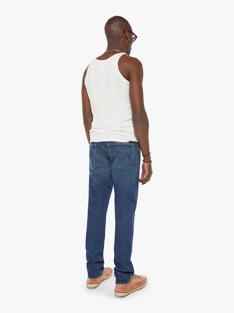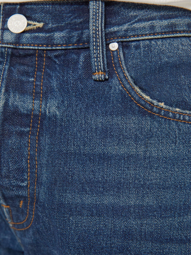 A cut above. A slim-straight leg with a mid rise, relaxed waist and hip, button fly and 33-inch inseam. Made from 100% cotton denim, Axe To Grind is a dark blue wash with whiskering and fading at the knee.