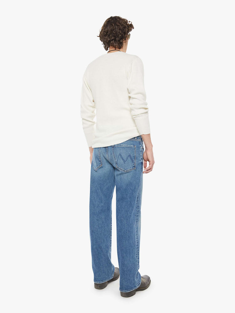A loose-fitting jean with a mid rise, zipper fly, 31-inch inseam and a clean hem. Made from stretch denim, Burning Bridges is a mid-blue wash with whiskering and fading at the knee.