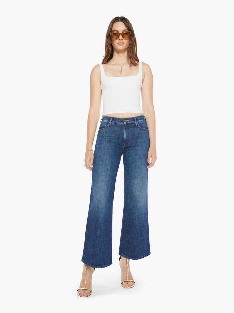 Less is more. High-rise jeans with a flared wide leg and 28.25-inch inseam with a clean hem. Made from semi-rigid denim, Clothing Optional is a dark blue wash with subtle whiskering and fading at the knee.