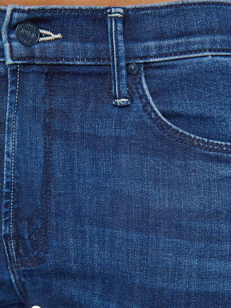 Surprise, surprise. Our most popular mid-rise straight leg hits at the ankle with a frayed hem. Made from stretch denim, Fancy Meeting You Here is dark blue with subtle whiskering and fading at the knees.