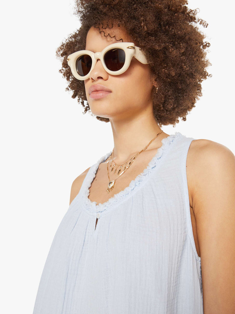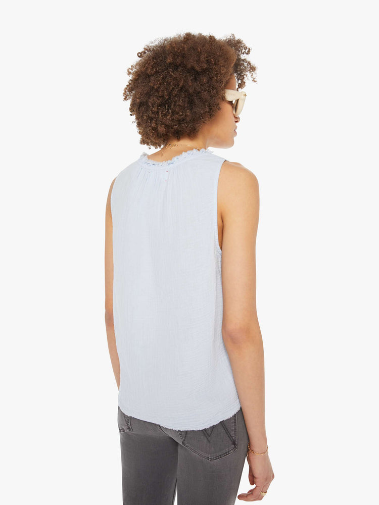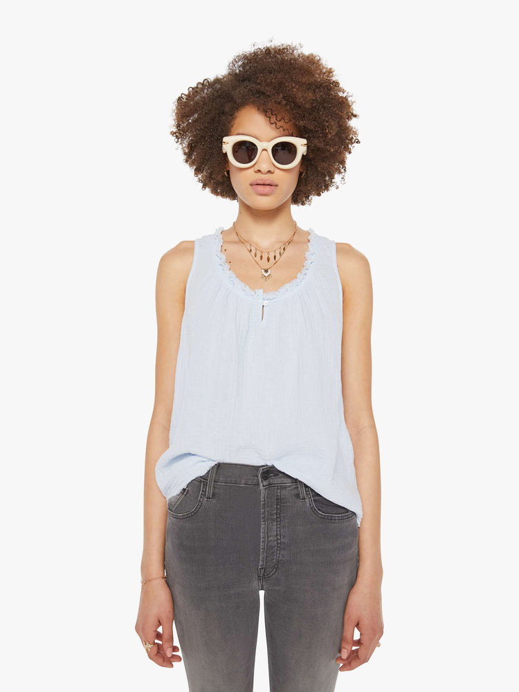 A tank from XiRENA, a free-spirited brand with deep roots in Cali that pays homage to the Golden State’s moods. Made from 100% cotton in baby blue, the tank has a ruffled crew neck, hip-length hem and a loose fit.