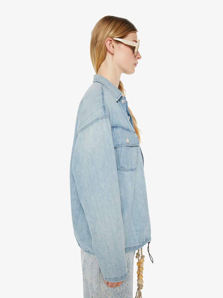 Easy does it. A denim button-up from Dr. Collectors, a Los Angeles brand known for its vintage-inspired designs, handcrafted details and reworked silhouettes. The collared shirt features angled patch pockets, drop shoulders and a slightly oversized fit. It's made from 100% cotton in a light-blue wash with fading throughout for a lived-in look.