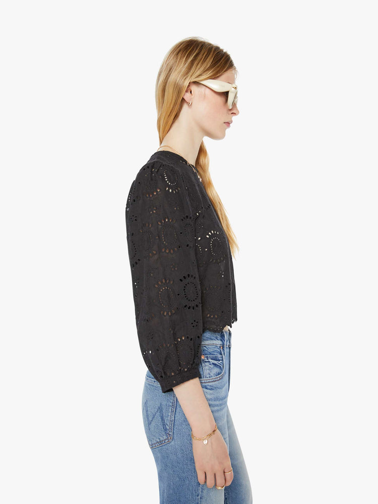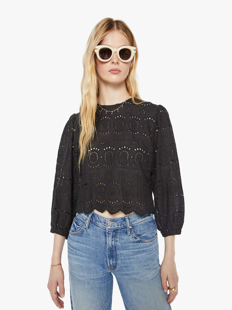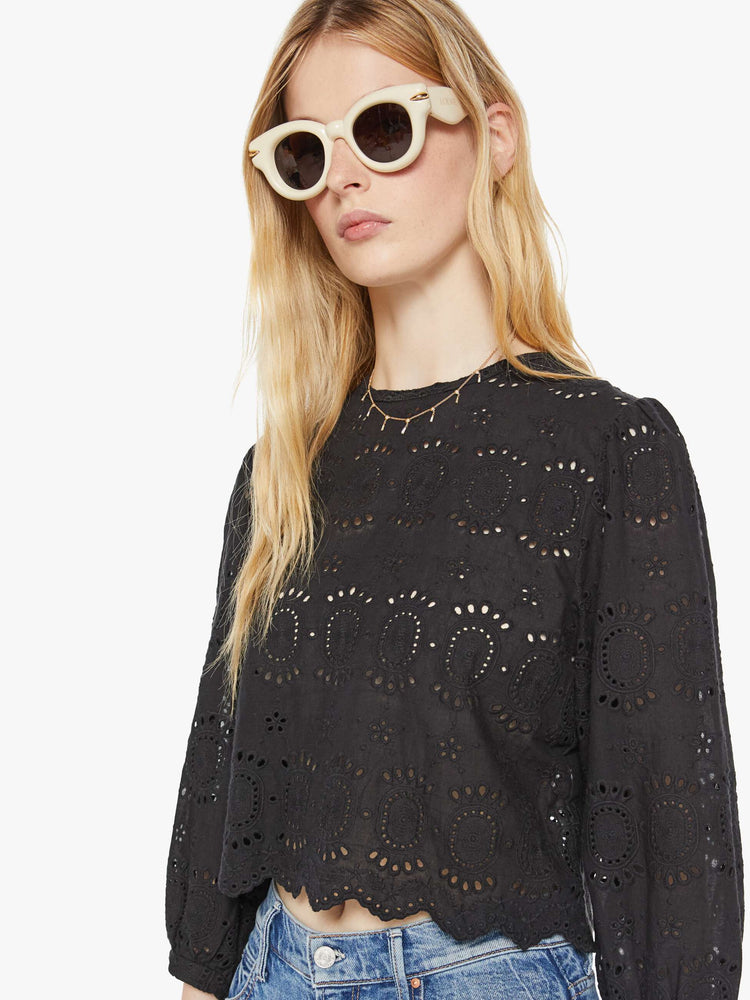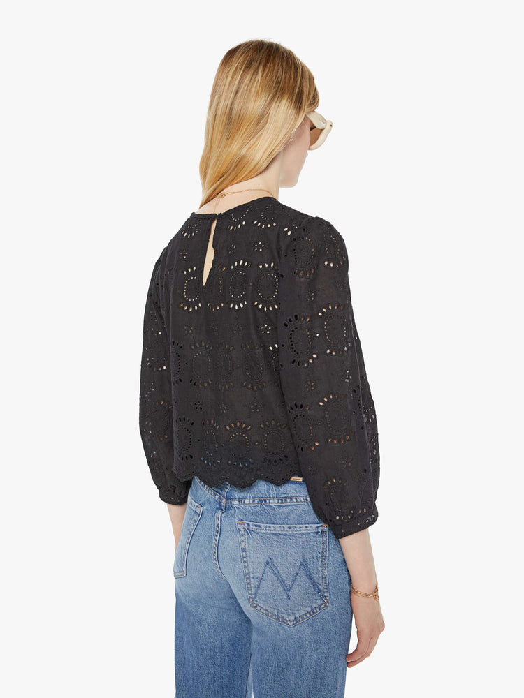 Sensing a pattern. A crewneck blouse from Natalie Martin, a Los Angeles brand that creates pieces for tripping out in Bali or in your own backyard. The top is made from 100% cotton in black with embroidery and eyelet details, and features a crewneck, 3/4-length balloon sleeves, a slightly cropped scalloped hem and a boxy fit.