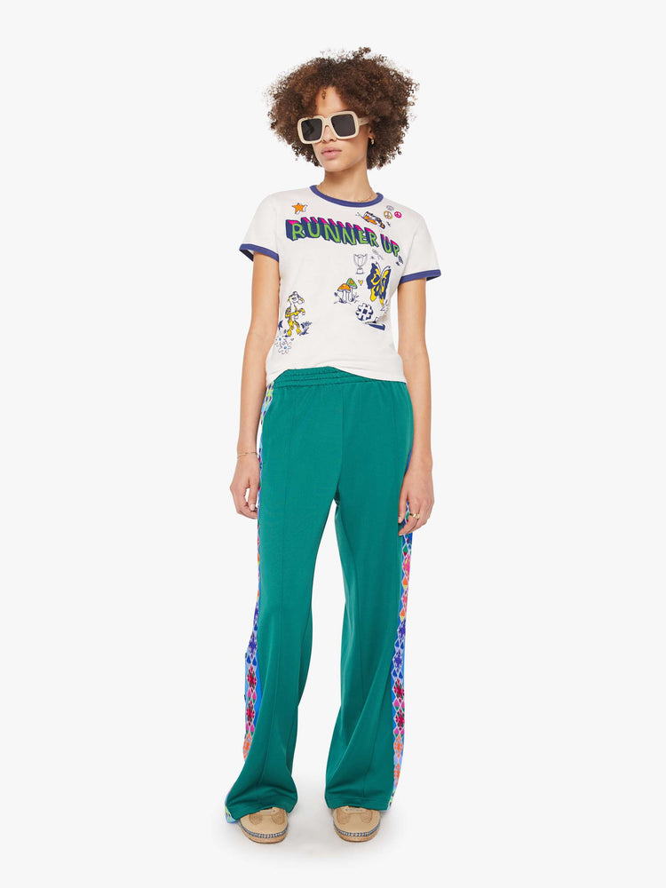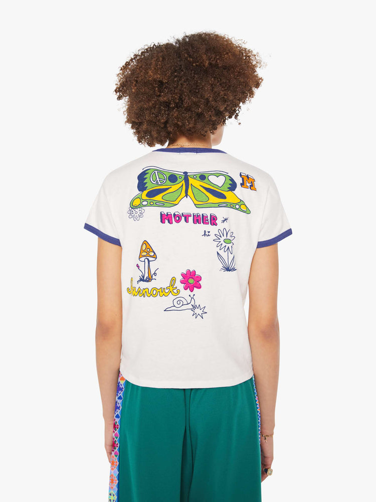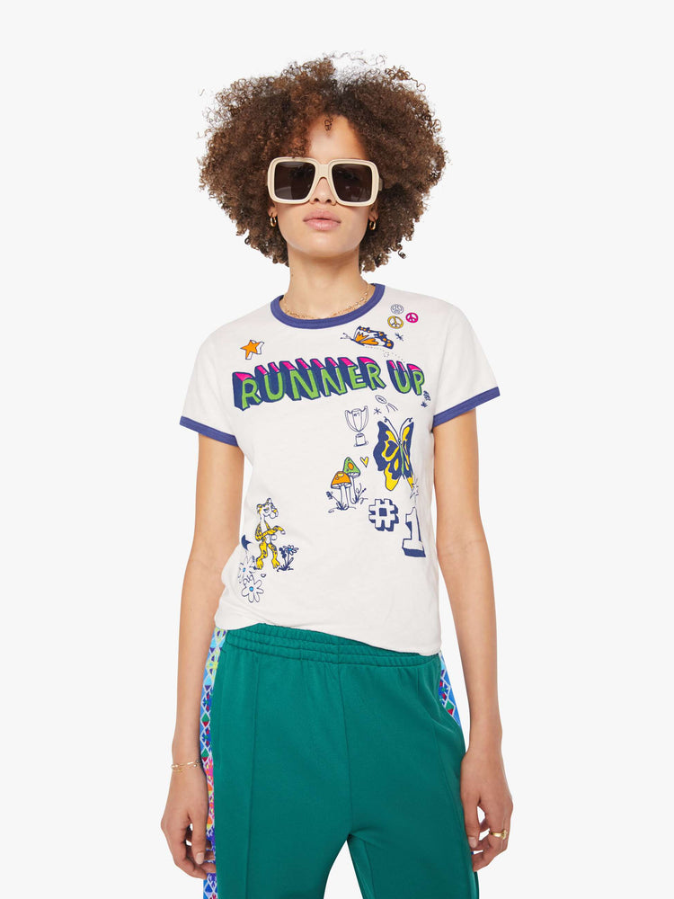 Second is the best. A crewneck tee with extra-short sleeves and a slightly shrunken fit. Made from a recycled cotton blend in white with navy trim, The Itty Bitty Ringer in Runner Up features hand-drawn 3D text and colorful doodles throughout.
